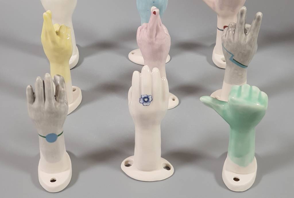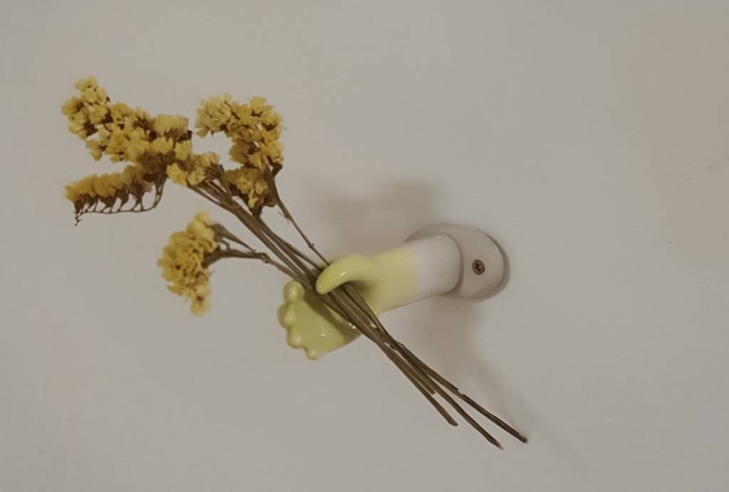 Trabaja sus dos materiales favoritos: la cerámica y el papel de morera coreano. El primero principalmente con moldes, para dar vida a unos objetos tan delicados como ella. Nuestro favorito: las perchas con forma de mano, en diferente posiciones y acabados.
