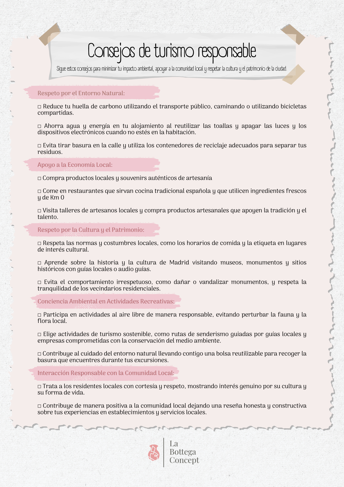 Para ayudarte a planificar tus próximas vacaciones de manera más consciente y alineada con los valores de La Bottega Concept, he preparado unos recursos descargables que te serán de gran utilidad. También te facilito algunos links a páginas que te pueden interesar.
